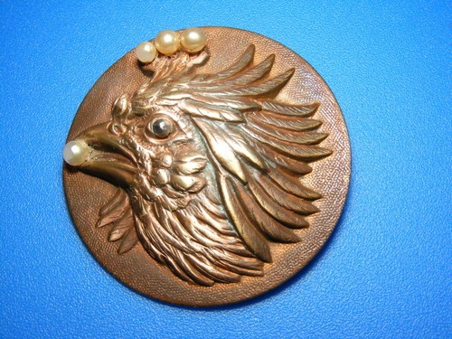Rare Lg Antique One Piece Stamped Brass Rooster Head W Pearls & a Cut Steel Eye
