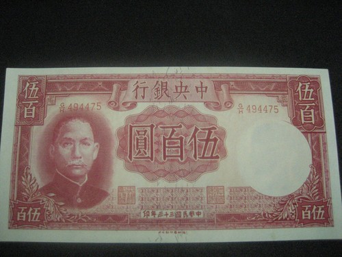 Collecters Item: 1944 $500 the Central Bank of China Banknote - Serial No. G/h494475