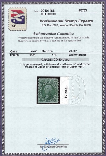 Collecters Item: Us Sc# 68 Used { 10c Washington W/ Pse Cert } Face Free Cancel of 1861 Cv$ 65.00