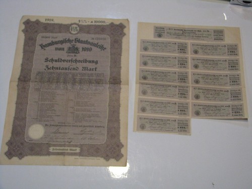Collecters Item: Ww1 German City of Hamburg 10,000 Mark War Reparations 4 1/2% Bond, 1919