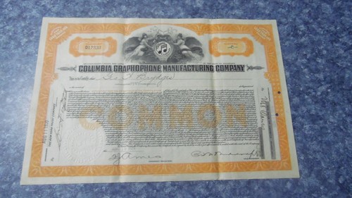 Collecters Item: 1920 Stock Certificate Columbia Grafonola Graphophone Manufacturing Co 5 Shares
