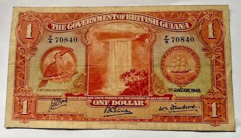 Collecters Item: British Guiana 1942 $1 Banknote Currency King George Vi *Toucan*