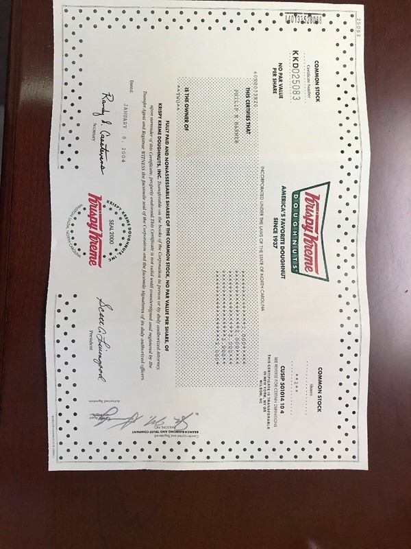 Collecters Item: Krispy Kreme Doughnuts Stock Certificate