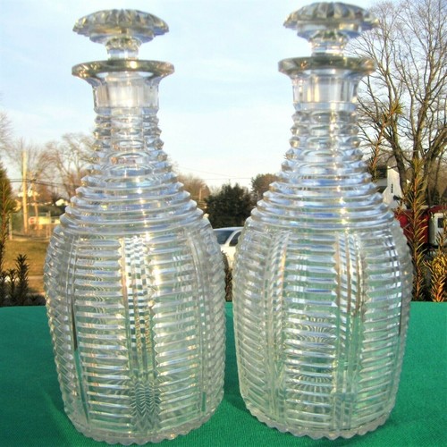 Valuable: Rare Pair Art Deco Vintage Cut Glass Whiskey Decanters Original Crystal Stoppers