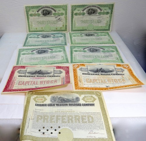 Vintage Stock Certificates - Chicago Great Western Railroad, Homestake Mining…