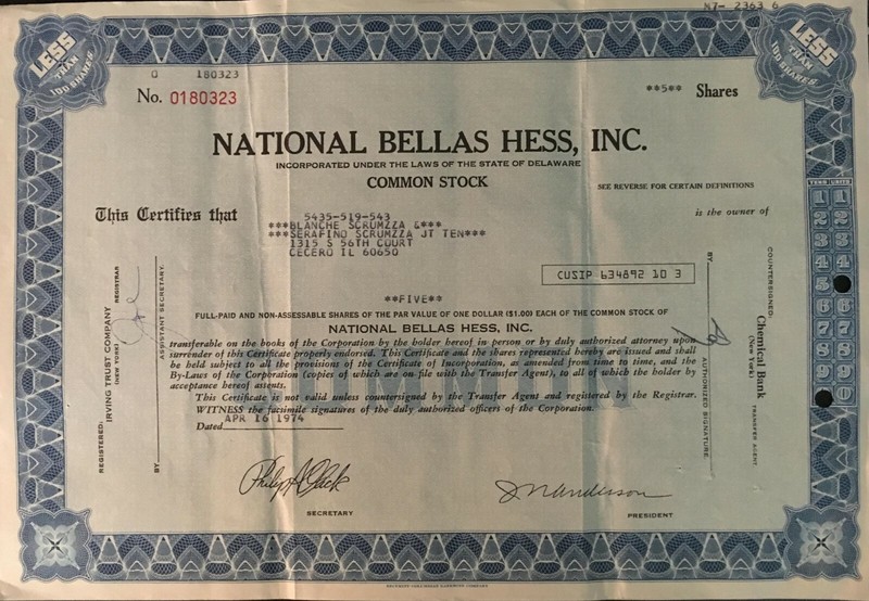 Collecters Item: National Bellas Hess, Inc. Common Stock Certificate
