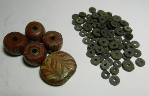 Four Round Antique Venetian Fancy Beads & 1 Tabular Feather Bead.Coconut Shells