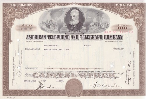 Set Of 3 Different Color At&T Stock Certificates W/ Vig Of Alexander Graham Bell