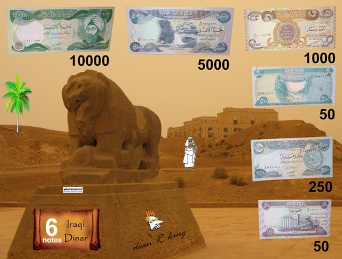 Collecters Item: 6 Notes, Iraqi Dinar - 10000X1, 5000X1, 1000X1, 500X1, 250X1 & 50X1 - Lion King!