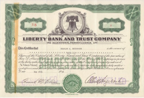 Lot Of 20 Stock Certificates For Liberty Bank And Trust Co