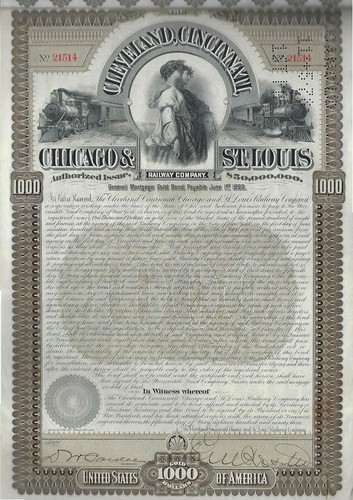 Collecters Item: Cleveland Cincinnati Chicago & St. Louis Railway Company Bond - #21514 1893