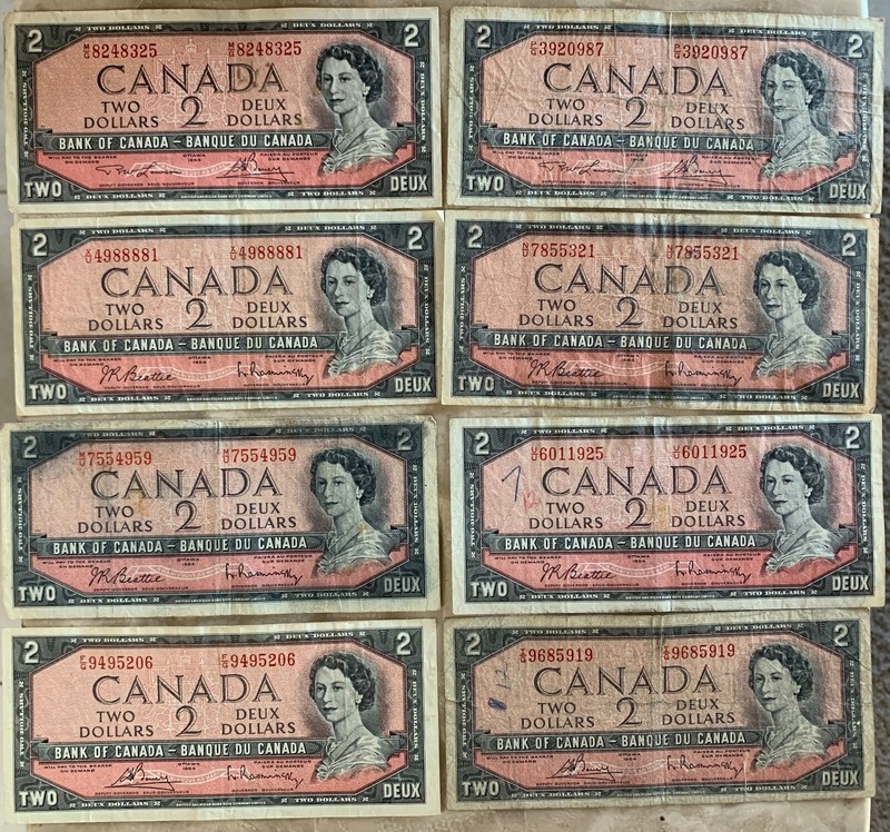 Collecters Item: Eight 1954 Canadian 2 Dollar Bill. Free Shipping In Usa Rare