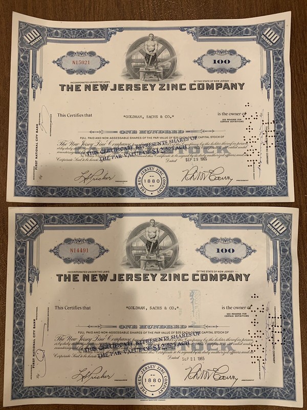 Collecters Item: New Jersey Zinc Company Stock Certificates Purchased By Goldman Sachs! Lot Of 2