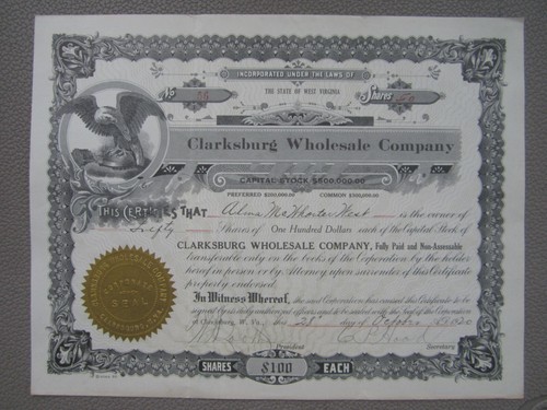 Collecters Item: Vintage 1920 Clarksburg Wholesale Co. Stock Certificate-Clarksburg,West Virginia