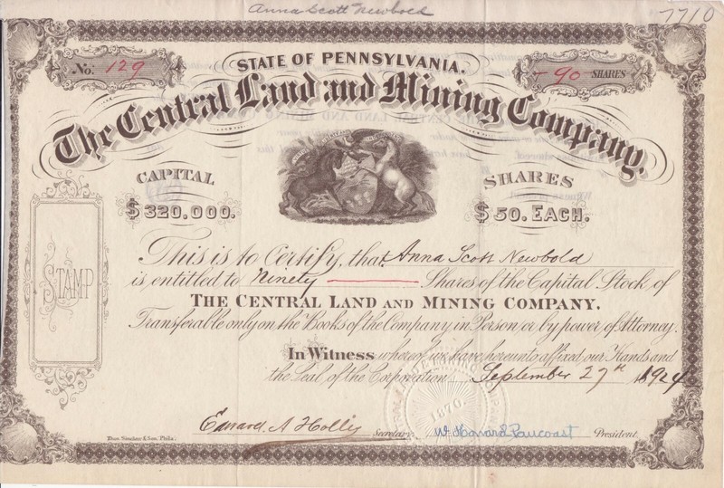 Collecters Item: 1924 Central Land And Mining Co Stock Certificate