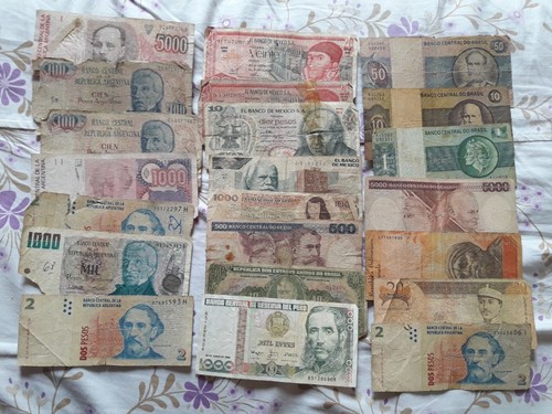 22 Banknotes From S. America: Peru, Brazil, Argentina, Mexico. Used / Damaged