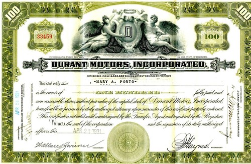 Collecters Item: 1931 Durant Motors Stock Certificate - 100 Shares