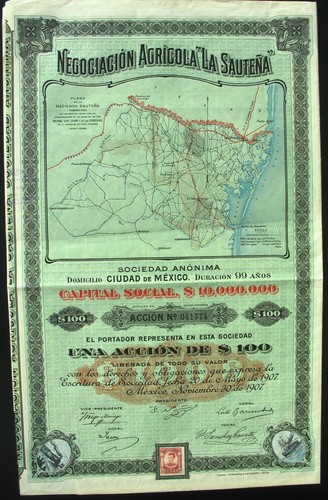 Collecters Item: Negociacion Agricola La Sautena Mexico 1907 Historische Agrar Aktie Mexiko