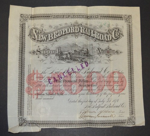 Collecters Item: Scarce 1874 New Bedford Railroad Company Ma $1000 Bond Certificate No. 6