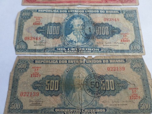 Collecters Item: Three 3 Old Brazil Brasil 1950-60S 500 1000 5000 Cruzeiros Circulated Banknotes