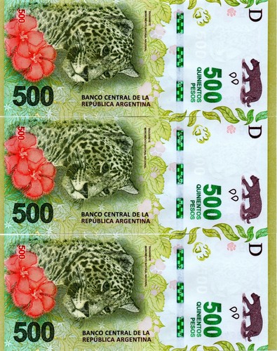 Pack Of 3 Argentina Bank Note 500 Pesos Series H / Yaguareté (Big Cat), Unc