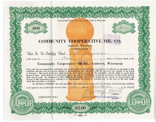 1946 Stock Certificate Community Cooperative Oil Co. Amherst, Wisconsin