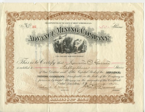 Vintage 1906 Stock Certificate- Advance Mining Company