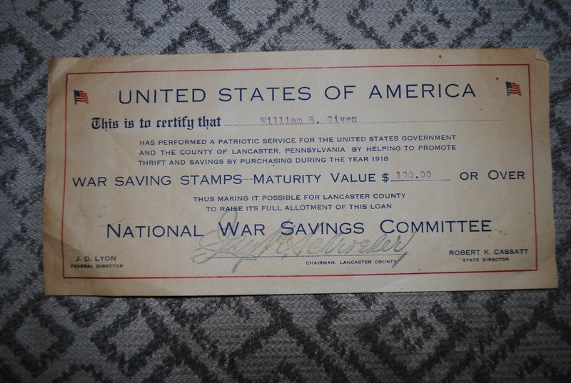 1918 War Savings Stamp Certificate, Issued From Lancaster Pennsylvania