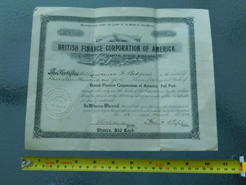 Vintage Antique 1912 British Finance Co Of America Stock Certificate Nj