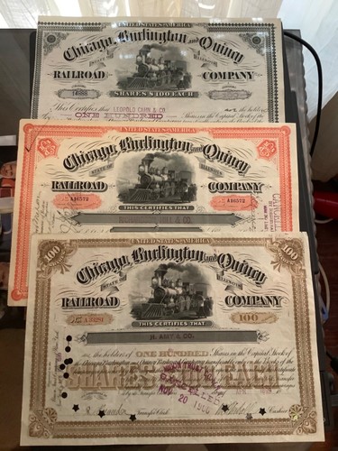 3 Different Chicago, Burlington And Quincy Railroad Stock Certificates