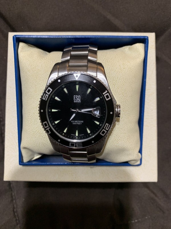 Mens Esq By Movado Black Dial Ss Band Divers 100M Quartz Watch E5420