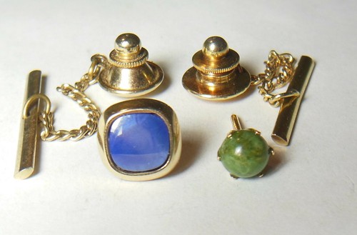 Two Small 14K W/Stones Tie Tac Pins, 1 Jade, 1 Blue Sapphire.Fine Mens Jewelry