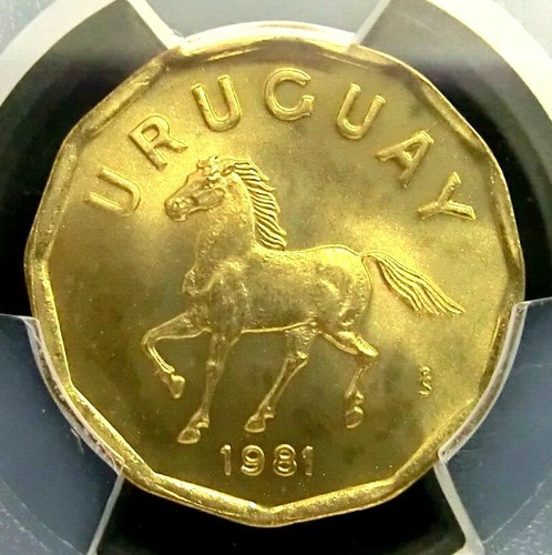Pcgs Ms67 Gold Shield-Uruguay 1981-So Horse 10 Centesimos Super Gembu