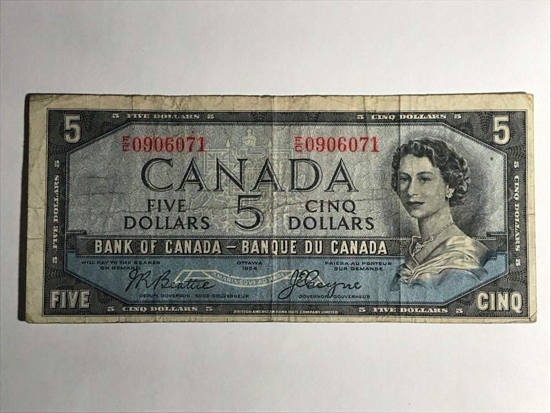 1954 Devils Face Canadian 5 Dollar Bill, Beattie/Coyne Signatures.