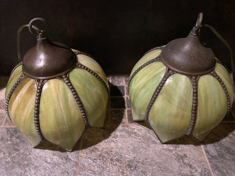 Antique Rare Green Gold Stained Glass Tulip Hanging Lights