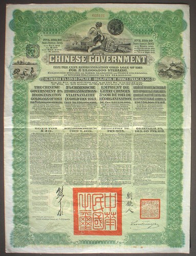 Chinese Government 5 % Gold Bond 20 ₤ 1913 Uncancelled + Coupons