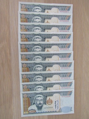 Set Mongolia:1000 Tugrik 10 Piece Lot Consecutive Banknotes 2013 Unc Condition