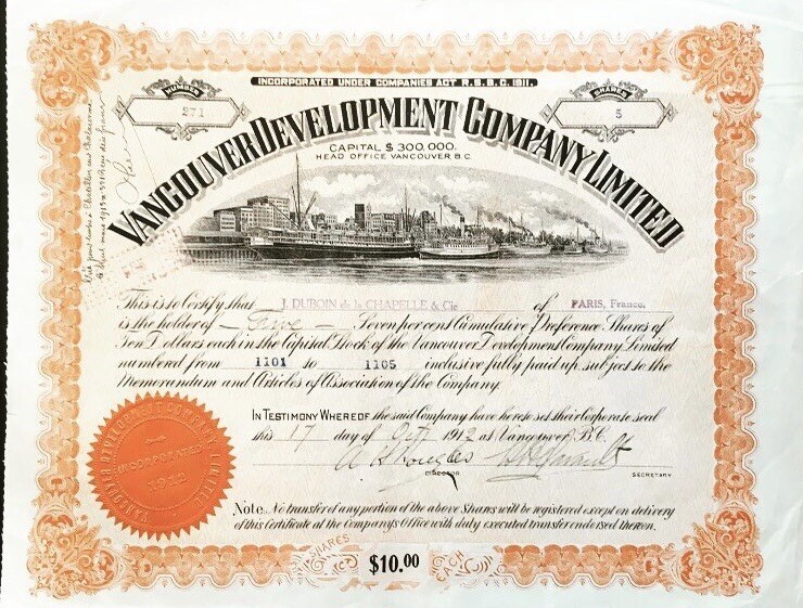 Vancouver B.C. Development Company 1912 Stock Certificate British Columbia
