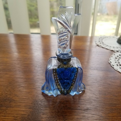 Rare Small Blue Jeweled Czech Perfume Bottle