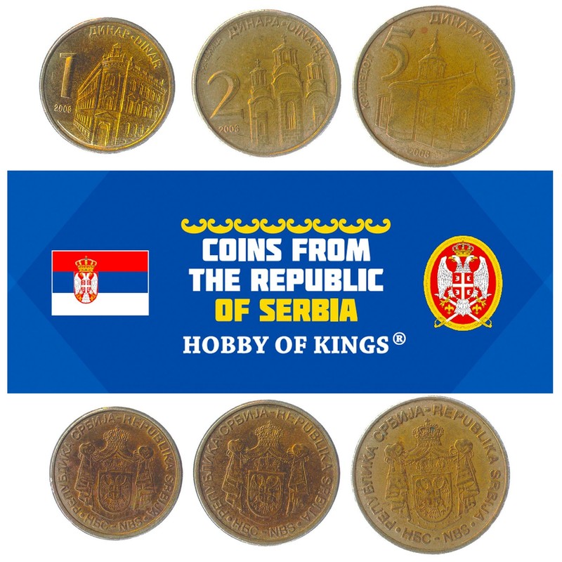 3 Different Coins From Serbia. Balkan Money, Currency: 1, 2, 5 Dinar 2006-2020