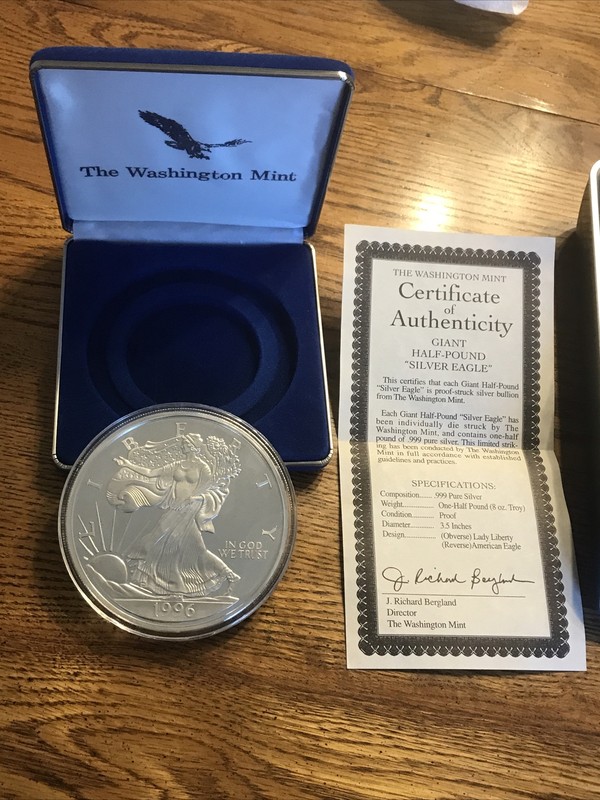 1996 Giant Half-Pound Silver Eagle Bullion Coin (8 Ounces) W/ Cert ,Rare Coin