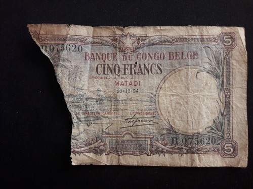 Belgian Congo 5 Francs (26.12.24) P-8C Matadi ****Missing 1/4 Of The Note****