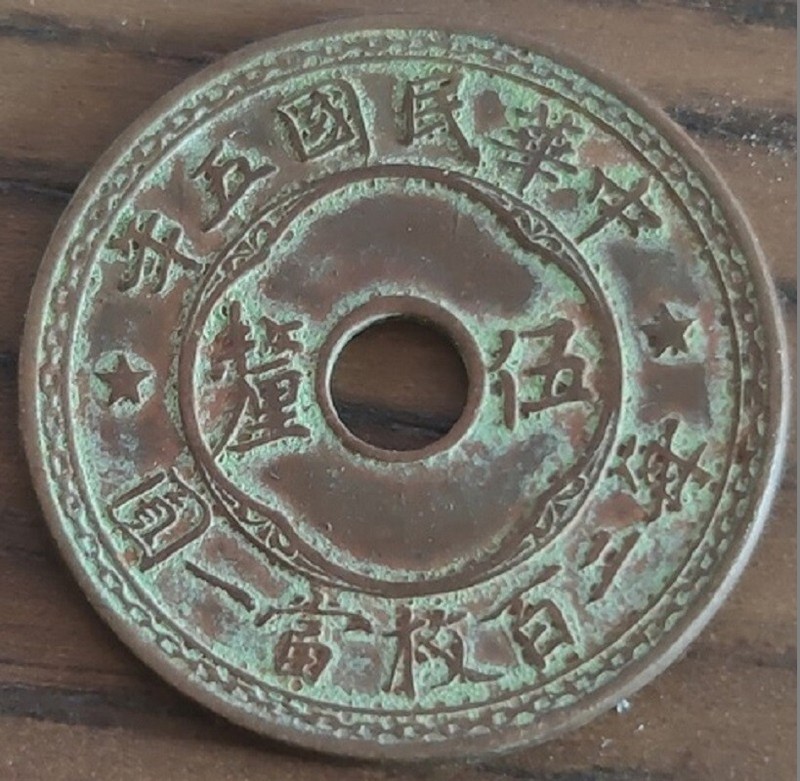 Republic Of China Five-Year Middle Hole 5 Li Copper Coin