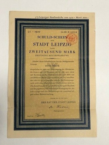Germany Bond Municipal Loan 1922 City Of Leipzig 2000Mark Uncancelled Bond 3914