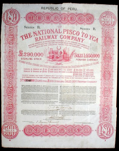 Republic Of Peru 100 £ 5% Guarantied Loan Pisco To Yca 1869, Uncanc. + Coupons