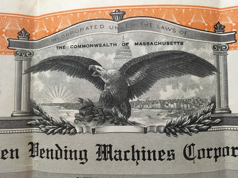 2X 1927 Vending Machine Company Stock Certificates Boston Ma Kollen Scripophily