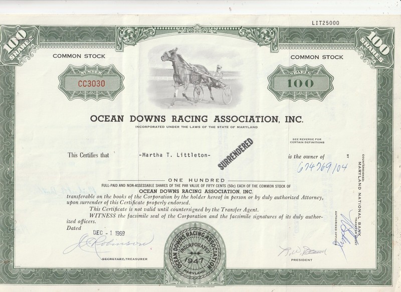 Ocean Downs Racing Association Common Stock Bonds Ranging From 1940S - 1980 S