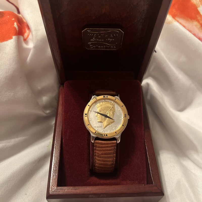 Vintage JFK John Kennedy Watch 1967 Gold Gilded Half Dollar With Leather Band