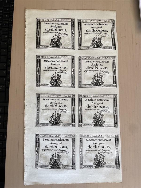 French Revolution Printed Sheet of 8 10 Sous Assignat 1792