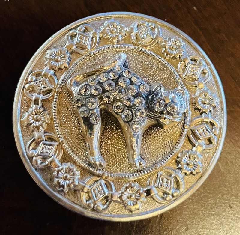 Ex Rare Antique Glittery Scary CAT Brass Button, ca.,1890s Early 1900s